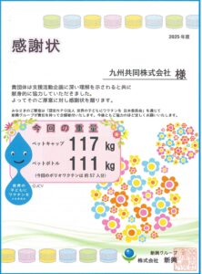 SDGs活動の一環として収集した、ペットボトル及びペットボトルキャップ支援の感謝状が(株)新興より届きました。